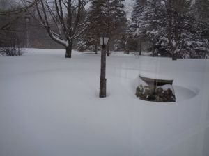 “Measured 28″ at our house before attempting to make a snowman out of the powdery snow. We made a mountain instead and carved a snowman family into it.” by Ashlyn and Bryce on West River Street.