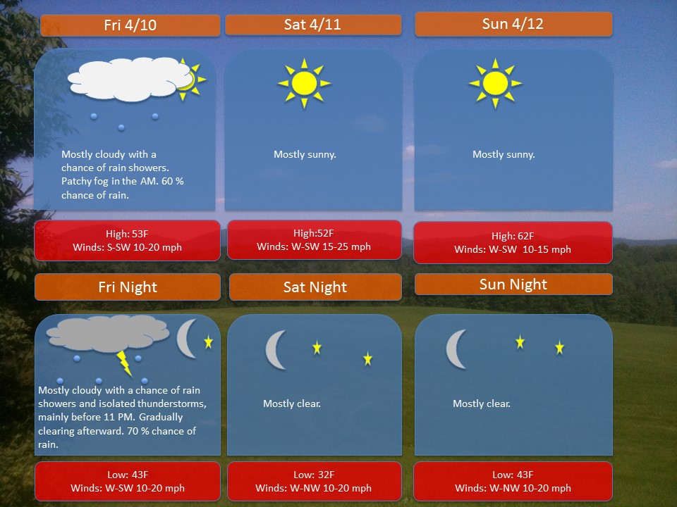 Overview: A warm front is moving through the region early this morning, associated with clouds, fog, and rain showers. Later this evening-night, a cold front will move through the area. This will be associated with another round of rain showers and a possible isolated storm. Behind this frontal passage, a ridge of high pressure will build in from the Midwest just in time for the weekend. You can expect mostly sunny skies and high temperatures in the 50s and 60s.