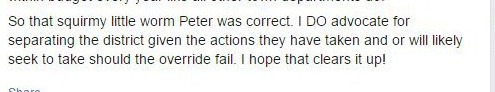 He is advocating a “no” vote hoping that so much harm is wrought upon Mendon that it will agitate residents into breaking up the school district.