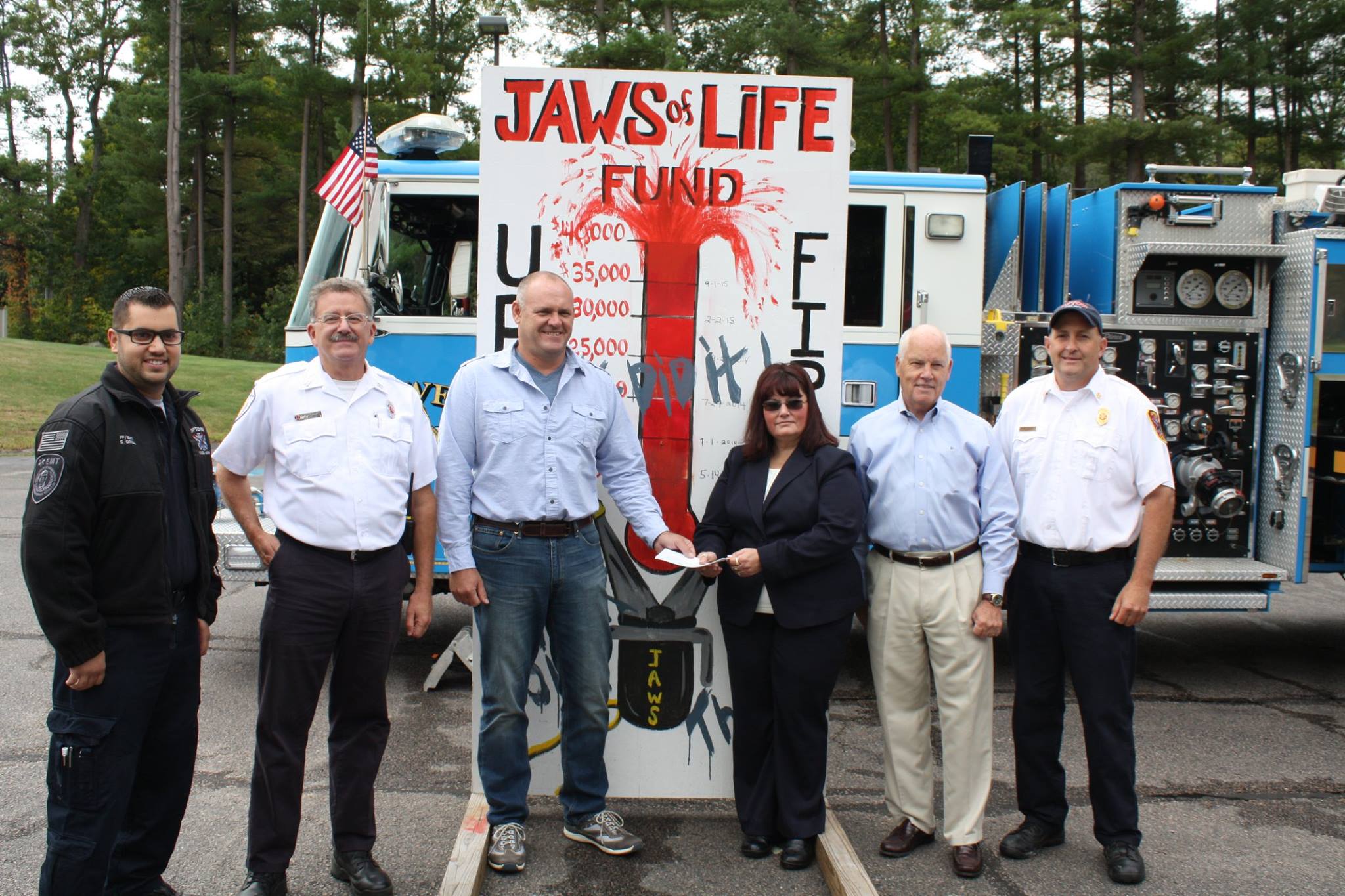 Chad Boardman presenting Pattie Marchand of the Fire/EMS Association with $3,500 donation towards Jaws of Life Fundraiser. L-R: Seth Grill – Upton FF/EMT, Brian Kemp – Upton EMS Captain, Chad Boardman – Eastman, Pattie Marchand – Upton FF/EMT Association, Bob Fleming – Upton Selectman, Ron Goodale – Upton Fire/EMS Chief