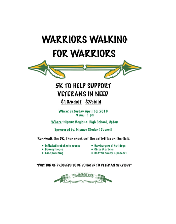 The Nipmuc Regional High School student council will be sponsoring the Warriors Walking for Warriors 5K to help support veterans … More